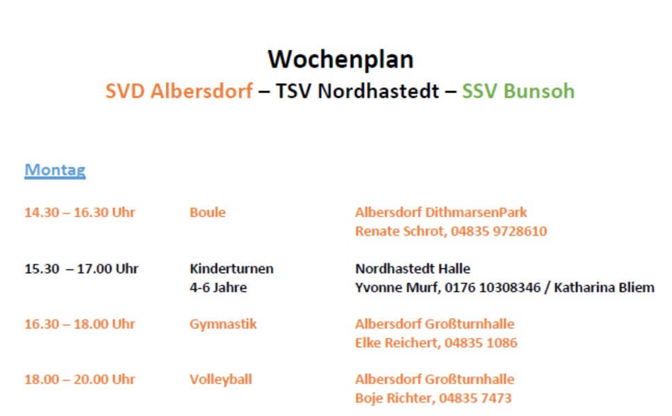 Mit dem SSV Bunsoh und dem TSV Nordhastedt besteht eine Kooperation. Ab sofort dürfen Mitglieder des SV Ditmarsia Albersdorf die Angebote unserer Partner nutzen und umgekehrt. In der Übersicht das gesamte Sportangebot: Sportangebot